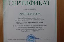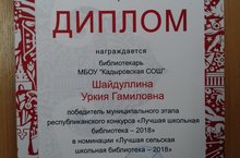 Шайдуллина У.Г. - победитель муниципального этапа республиканского конкурса "Лучшая школьная библиотека - 2018" в номинации "Лучшая сельская школьная библиотека - 2018". Поздравляем!