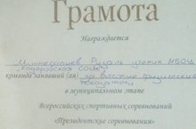 "Президент ярышлары" бөтенроссия спорт ярышларында югары күрсәткечләре өчен Миннегалиев Рүзәл грамота белән бүләкләнде. Афәрин, Рүзәл!