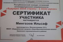 Ученик 10 класса Мингазов И.Р. занял второе место в муниципальном этапе республиканского конкурса творческих работ (сочинений-эссе) обучающихся национальных школ "Будущее моей страны - в моих руках” (руководитель: Миннегалиева З.Р.)