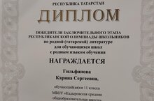 Итоги участия в заключительном этапе республиканской олимпиады школьников по родной (татарской) литературе для обучающихся школ с родным языком обучения 5 марта 2025 года на базе оздоровительно – образовательного комплекса «Дуслык» ГАОУ «Республиканский олимпиадный центр» проведен заключительный этап республиканской олимпиады школьников по родной (татарской) литературе для обучающихся школ с родным языком обучения. По итогам участия в олимпиаде победителем стала: Гильфанова Карина, ученица 11 класса МБОУ «Кадыровская СОШ», Зарина Нуруллина - участник, учитель Аюпова Алсу Фаитовна. Молодцы! Карина, огромное спасибо! Ты - гордость нашей школы, нашего района! Поздравляем с победой в олимпиаде! Карина, Зарина, желаем Вам как можно больше таких же побед, интересных знакомств, положительных эмоций и заслуженных наград. Успехов и достижений! -- 06.03.2025