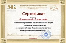 Поздравляем нашу активистку ученицу 9 класса Анжелику Антонову с получением сертификата! Молодец, Анжелика! Желаем с таким же упорством продолжать участвовать на конкурсах. Желаем успехов, саморазвития, интересных открытий и важных событий в жизни! 06.03.2025