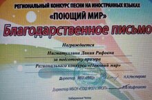 Благодарственное письмо учителю английского языка Нигматуллиной Д.Р. за подготовку призера в региональном конкурсе песни на иностранных языках "Поющий мир" 13.01.2023