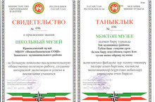 За большую поисково-исследовательскую общественно-полезную работу, создание интересной экспозиции и успехи в воспитании учащихся республиканской комиссией по паспортизации школьных музеев МО и Н РТ краеведческому музею МБОУ "Нижнебишевская СОШ" выдано свидетельство о присвоении звания "Школьный музей".