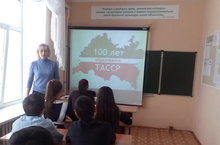 В рамках празднования 100 летия образования ТАССР прошел классный час "Татарстан.Века и Годы". Учитель Иванова Л.А. рассказала ребятам, об истории нашей республики, традициях, обычаях и культуре, и о том, как развивается Татарстан в настоящее время. Ребята активно приняли участие в познавательной викторине "По страницам истории ТАССР" .