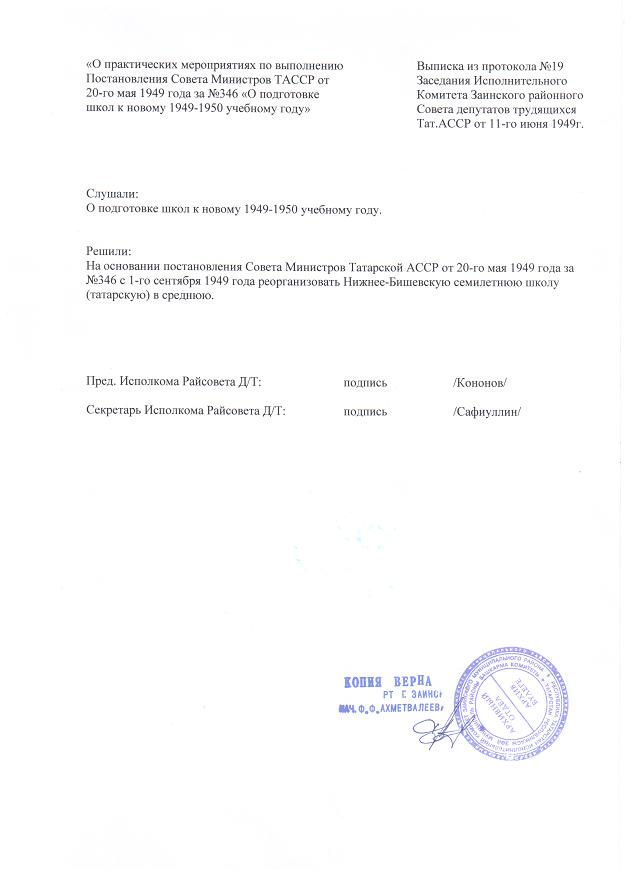 Архив Выписка из протокола о реорганизации в среднюю Нижнебишевская СОШ 1949 год