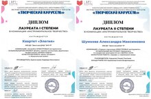 Стали известны результаты Международного патриотического конкурса "Великой Победе посвящается". В номинации "Инструментальное исполнительство" квартет преподавателей "Элегия" в составе: Люция Кадырова, Надежда Бурмистрова, Римма Блинова, Татьяна Филимонова стал - Лауреатом l степени.