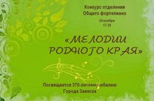 24 ноября, в Заинской ДМШ состоялся ежегодный школьный конкурс по общему фортепиано "Мелодии родного края". В этом году он посвящён 370-летию города Заинска, и был нацелен на лучшее исполнение произведений татарских композиторов.