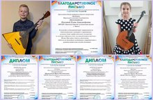 Подведены итоги XIII Международного фестиваля-конкурса детского и юношеского творчества «Содружество талантов», который проходил с 1 по 25 декабря в г.Казань в заочном формате. Организатором конкурса стал Фонд поддержки детского творчества «Виктория» г.Казань при поддержке Министерства образования и науки РТ и Министерства культуры РТ. В конкурсе приняли учащиеся класса преподавателя Коклиной Елены Александровны. В младшей возрастной группе Лауреатами II степени стали Хохлушина Арина (домра) и дебютант конкурса Макаров Глеб (балалайка). Педагог и концертмейстеры: Нырова Ирина Яковлевна и Мартынова Ирина Валентиновна отмечены Благодарственными письмами.