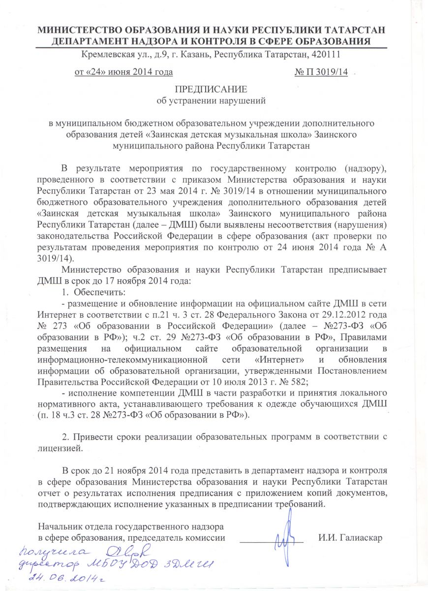 ПРЕДПИСАНИЕ об устранении нарушений (от 24.06.2014г.)