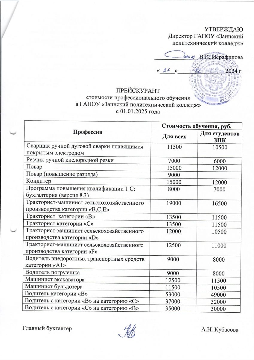 Прейскурант стоимости профессионального обучения в ГАПОУ "Заинский политехнический колледж"