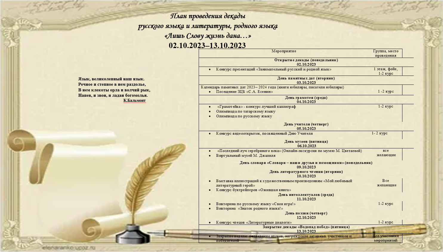 Традиционно Декада открылась конкурсом тематических презентаций «Занимательный русский и родной язык». Во второй день декады в библиотеке колледжа прошла выставка книг «Календарь памятных дат 2023 – 2024 года», содержащая информацию о праздниках и юбилеях отечественных и зарубежных писателей, поэтов, литературных произведений. 3 октября для групп 1131 и 1431 в Центральной библиотеке им. С. Рафикова состоялся Есенинский праздник поэзии «Певец возвышенный и юный», посвященный 128-ой годовщине со дня рождения русского поэта Сергея Александровича Есенина. Ребята познакомились с шедеврами любовной лирики Сергея Есенина. Эта встреча приоткрыла завесу тайны над личной жизнью поэта, звучали стихи в исполнении самих учащихся, были прослушаны песни и романсы.