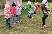 Сегодня подготовительная группа "Звездочки" на прогулке демонстрировали свои умения прыгать через скакалку на одной ноге и на двух, через длинную и короткую скакалку. Ведь это веселое развлечение не требует большого пространства, достаточно места на участке. Использование скакалки приносит ребенку не только радость, но и пользу для здоровья. Прыжки со скакалкой - самая интересная, полезная, и к тому же доступная форма двигательной активности детей дошкольного возраста. Прыжки способствуют развитию таких важных физических качеств, как ловкость, прыгучесть, выносливость, быстрота. А сколько игр знают дети со скакалкой! И часто придумывают свои игры новые с правилами.
