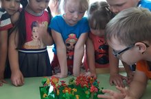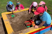 Дети старшей группы «Звёздочки», сегодня постигают приёмы строительства из песка. Создание и обыгрывание построек обеспечивает развитие детского творчества. Манипулятивные действия с песком вызывают у ребёнка чувство комфорта, удовольствия, радости, что благоприятно сказывается на работе всех функций и систем организма. Таким образом, у детей развивается умение общаться друг с другом: договариваться, планировать и осуществлять строительство построек из песка, обсуждать свои постройки и выполненные другими детьми.