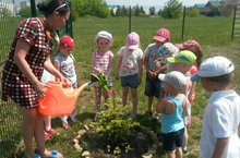 Җәй җитү белән без балалар белән берлектә уен мәйданчыгына бик матур чәчәкләр утыртыртабыз. Балалар һәр көнне уйнарга чыккач, шушы табигать кочагына чумалар. Күзәтүләр ярдәмендә алар чәчәкләрнең исемнәрен өйрәнәләр. Балалар белән бергәләп аларның төпләрен йомшартабыз, су сибәбез. Бала бу эшләр вакытында үзен чорнап алган табигатьнең аның ярдәменә мохтаҗ икәненә төшенә, аны үстерү, матурлау теләге туа.
