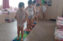Балаларның сәламәтлекләрен ныгыту максатыннан, безнең икенче кечкенәләр төркемендә системалы рәвештә чыныктыру чаралары үткәрелә. Балаларда яссы табанлылык булдырмау максатыннан төркемгә аяк табанына массаж ясый торган юл алынды. Алар шул массаж юлында бик рәхәтләнеп йөриләр һәм чыныгалар.