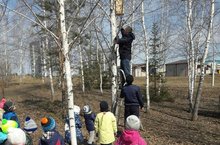 Менә буген “Сандугачлар” төркеме һәм этиләр белән берлектә агачларга сыерчык ояларын элеп чыктылар. Алар бик тырышты һәм без парк тирәсендәге агачларга булышчыларыбыз ярдәмендә сыерчык оясы элеп куйдык. Ә безнең балалар өчен бу бик зур вакыйга булды: кемдер ояны ничек ясаганын, кемдер әтисенең ничек итеп ояны биеккә куйганын, кемдер үзенең оясының иң матуры булуын сөйләде. -