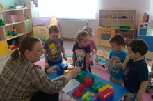 Дети упражнялись различать предметы по форме и количеству, называть их словами. А затем пробовали сооружать несложные постройки.