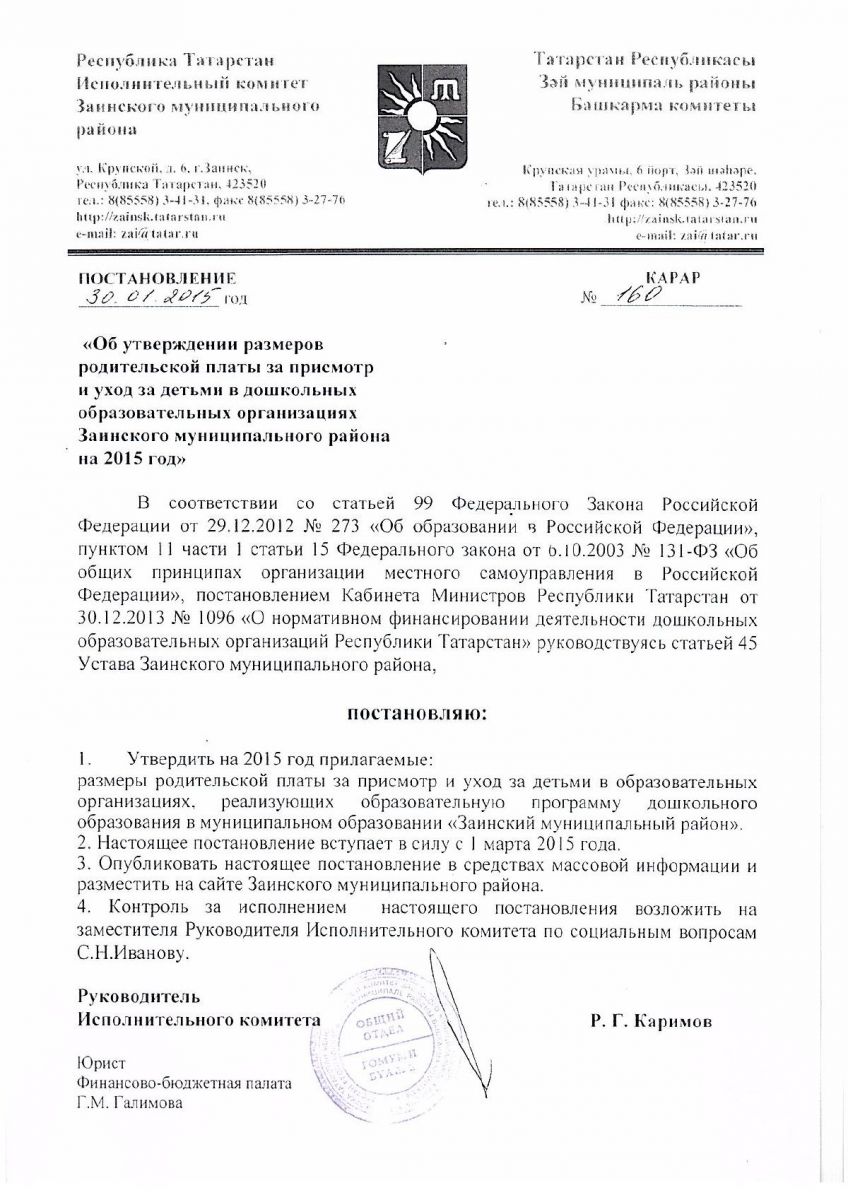 - Постановление "Об утвержлдении размеров родительской платы на 2015 год" от 30.01.2015 г. №160