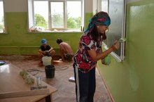 В школе осуществляются ремонтные работы : покраска окон, стен.