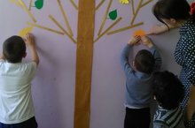 Воспитанники старшей и подготовительной группы детского сада " Колосок" сотворили аппликацию на стене " Времена года"