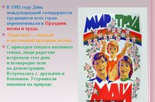 Этот праздник много лет в России имел политическую окраску. Назывался он Днём международной солидарности трудящихся, отмечался демонстрациями, воинскими парадами
