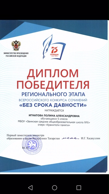 В рамках проведения Года памяти и славы подведены итоги регионального этапа Всероссийского конкурса сочинений «Без срока давности», приуроченного 75-летию Победы в Великой Отечественной войне. 6 февраля в Казани наградили победителей регионального этапа Всероссийского конкурса сочинений «Без срока давности». Победителем стала ученица 5 класса МБОУ «ЗСОШ №6» Игнатова Полина. -