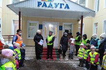Проведение акции "Родительский патруль" в детском саду «Радуга» стало уже традицией. Акция организована с целью привлечения внимания общественности к проблеме обеспечения безопасности дорожного движения детей-пассажиров. Сегодня в Родительский патруль вышел Совет отцов дошкольного учреждения с девизом: "Кто знает правила движения, тому почёт и уважение!"