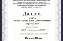 Поздравляем Кадирова Юсуфа с Дипломом призера региональной олимпиады по географии и учителя географии Тазова Радика Михайловича, подготовившего ученика!