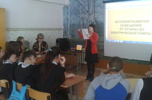 15 декабря для учащихся 1-9,11 классов был проведён Всероссийский урок «Свет в нашей жизни» посвящённый Международному году света и световых технологий. Целью урока было познакомить обучающихся с проблемами энергосбережения в разных отраслях хозяйства и возможными путями их решения, мотивировать на энергосберегающий образ жизни, развить активный познавательный интерес к изучению вопросов энергосбережения и применения этих знаний на практике. В ходе урока была представлена презентация «История развития освещения. От лучины до электрической лампочки…», а также самими учащимися были озвучены наиболее интересные факты о свете. В заключительной части урока классные руководители познакомил учащихся с приборами учёта и регулирования энергопотребления.