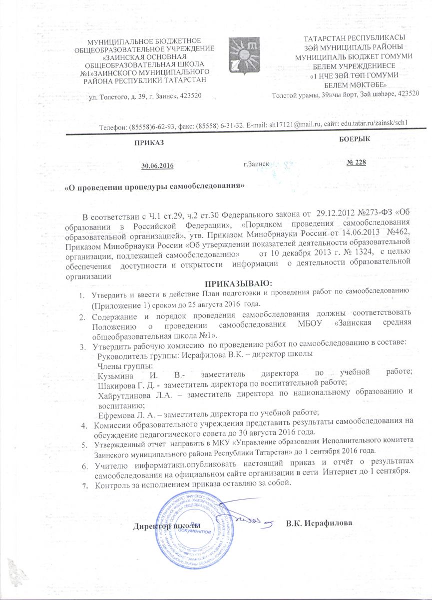 Отчет по результатам самообследования МБОУ ЗООШ №1 2016 год