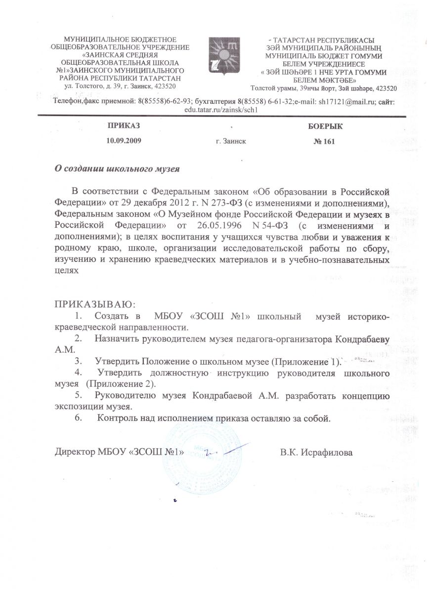 Приказ №161от 10_09_2009 о создании школьного музея.jpg