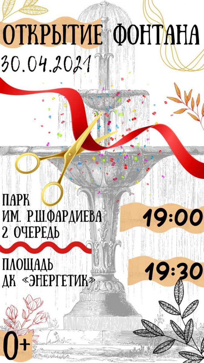 30 апреля 2021 года в 19.00 часов в парке им. Р.Ш.Фардиева (2 очередь) состоится открытие фонтана.
