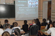 Во всех классах школы прошли классные часы "Трагедия Беслана". Педагоги рассказывали школьникам о террактах и их жертвах, особенно о трагедии, которая произошла в Северной Осетии в школе № 1 г.Баслана. В День солидарности в борьбе с терроризмом, вспомнили жертв теракта, унесшего жизни 334 человек, в том числе 186 детей, чьи имена навсегда останутся в памяти людей.