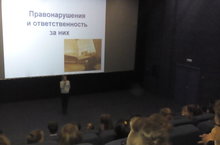 23 октября инспектор ПДН Майорова в кинотеатре «Космос» провела беседу "Правонарушения и ответственность за них" с учащимися 8-х и 9-х классов. В беседе она затронула проблема правонарушений в среде детей-подростков и пагубные последствия, наступающие в результате их совершения. Подобные мероприятия проводятся для повышения уровня культуры и информированности о способах борьбы с негативными проявлениями в поведении детей-подростков. Также учащиеся посмотрели фильм "На мосту".