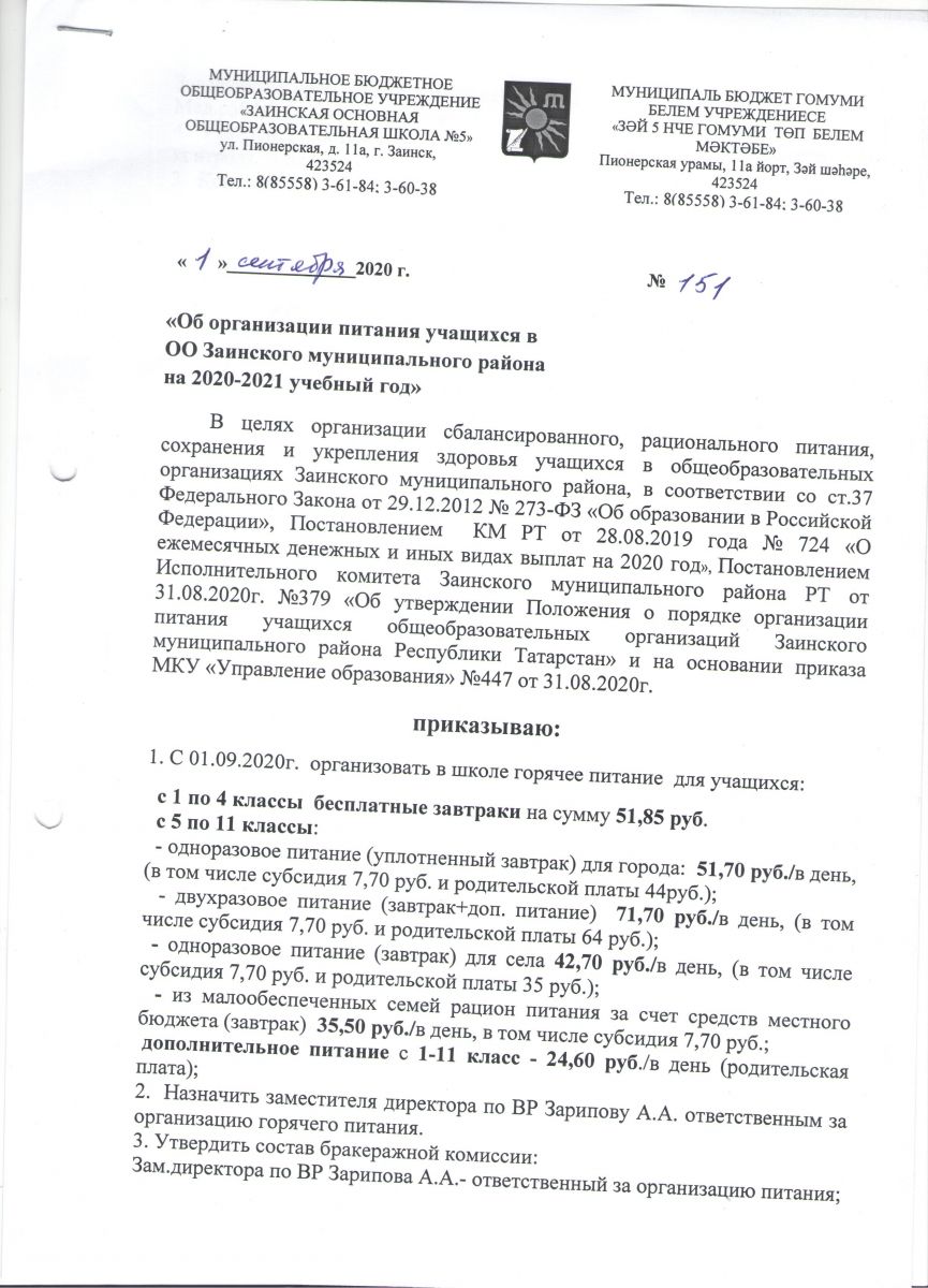 Телефон горячей линии "Школьный завтрак" в Заинском районе 88555871430