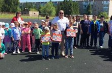 26 июня детей пришкольного лагеря поздравил Иванов Вадим Валентинович, который вручил детям подарки: пазлы по правилам дорожного движения, брошюры, книги, памятки по безопасности. На школьном автогородке дети ежедневно катаются на велосипедах, проводятся занятия по проверке правил, интересные викторины и игры.