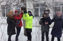 Учащиеся школы делают кормушки из подручного материала и вешают их на пришкольной территории.
