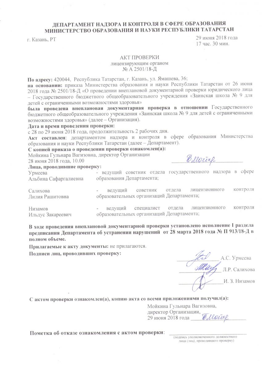 Акт об исполнении предписания I части