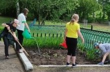 Трудовой десант в лагере труда и отдыха. Ребята ухаживают за клумбами.