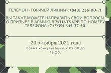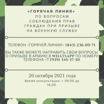 По вопросам соблюдения прав граждан при призыве на военную службу можно позвонить по телефону "Горячей линии": (843) 236-00-71. Время консультаций 20 октября с 09.00 до 16.00.