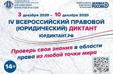 С 3 по 12 декабря 2020 года в онлайн-режиме пройдет IV Всероссийский правовой (юридический) диктант, организаторами которого выступают «Деловая Россия» и Ассоциация юристов России. Принять участие в тестировании можно на сайте юрдиктант.рф.