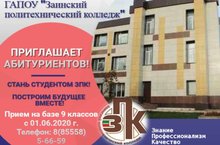 ГАПОУ "Заинский политехнический колледж" приглашает абитуриентов стать студентом ЗПК. Прием на базе 9 классов с 01.06.2020 года. С информацией о программах подготовки специалистов среднего звена, квалифицированных рабочих и служащих можно ЗДЕСЬ