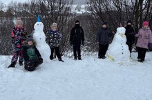 Сегодня дети на свежем воздухе лепили снеговика. Дети разделились на две команды, каждой из которых выдали набор «снеголепительного» инвентаря: колпаки, краски, веточки и так далее. Задача заключалась в том, чтобы как можно быстрее слепить полноценного снеговика.