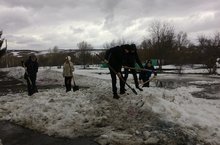 Язгы чистартулар дәвам итә. Укучылар мәктәп янындагы карларны тараталар, чүп җыялар.