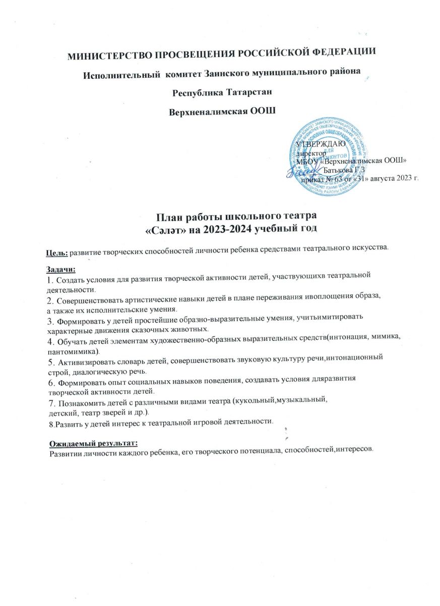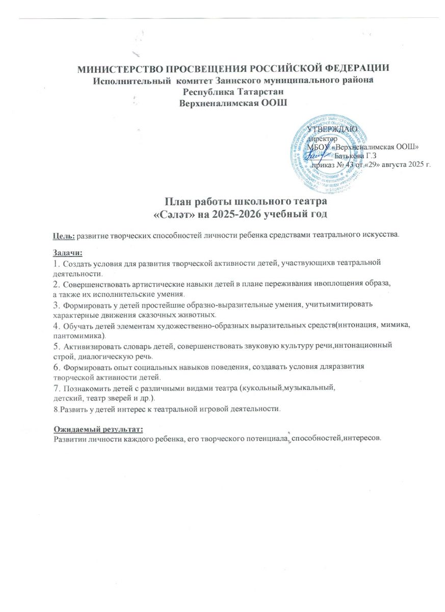 План работы школьного театра "СӘЛӘТ" на 2025-2026 учебный год
