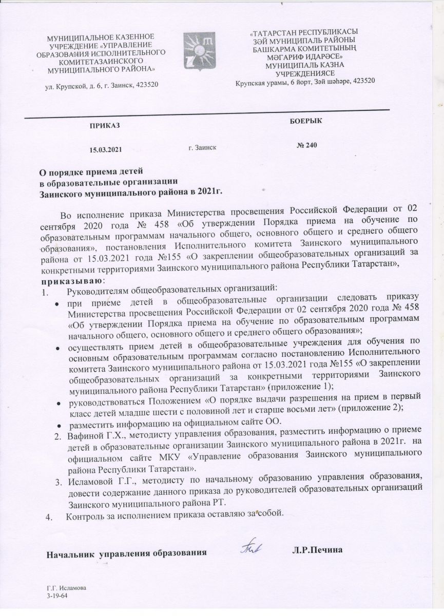 Приказ «О порядке приема детей в образовательные организации Заинского муниципального района в 2021 г» Посмотреть