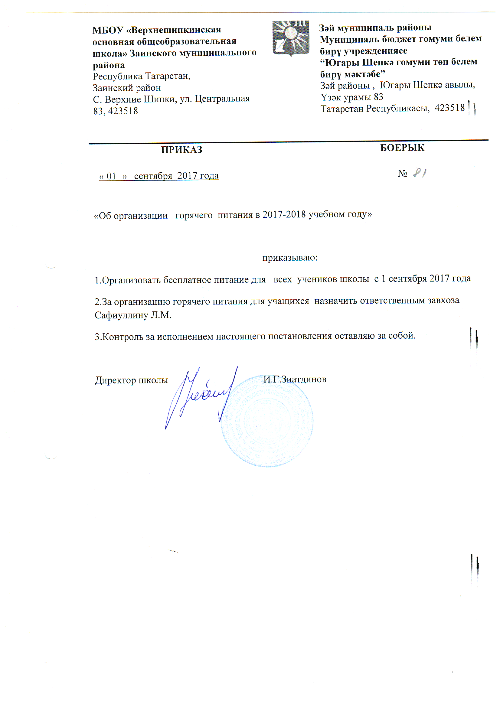 Приказ об организации питания в МБОУ "Верхнешипкинская ООШ"   Скачать